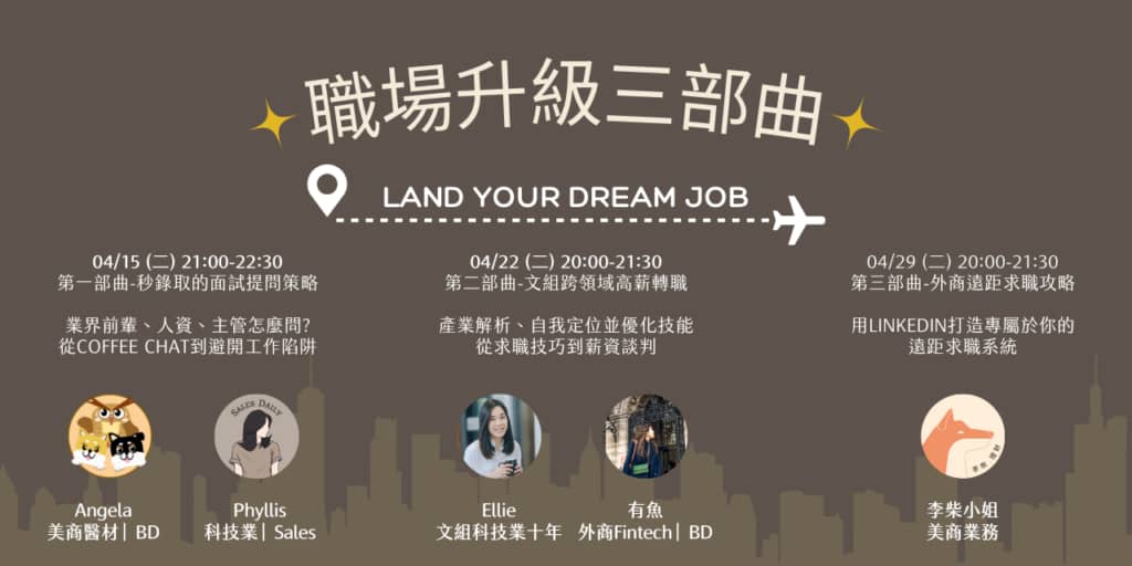 還想跟大家分享另外一個優質職涯活動,由多位外商工作者舉辦的經驗分享活動「職場升級三部曲 Land Your Dream Job」,Ariel 也三場都會聽,同步分享給大家