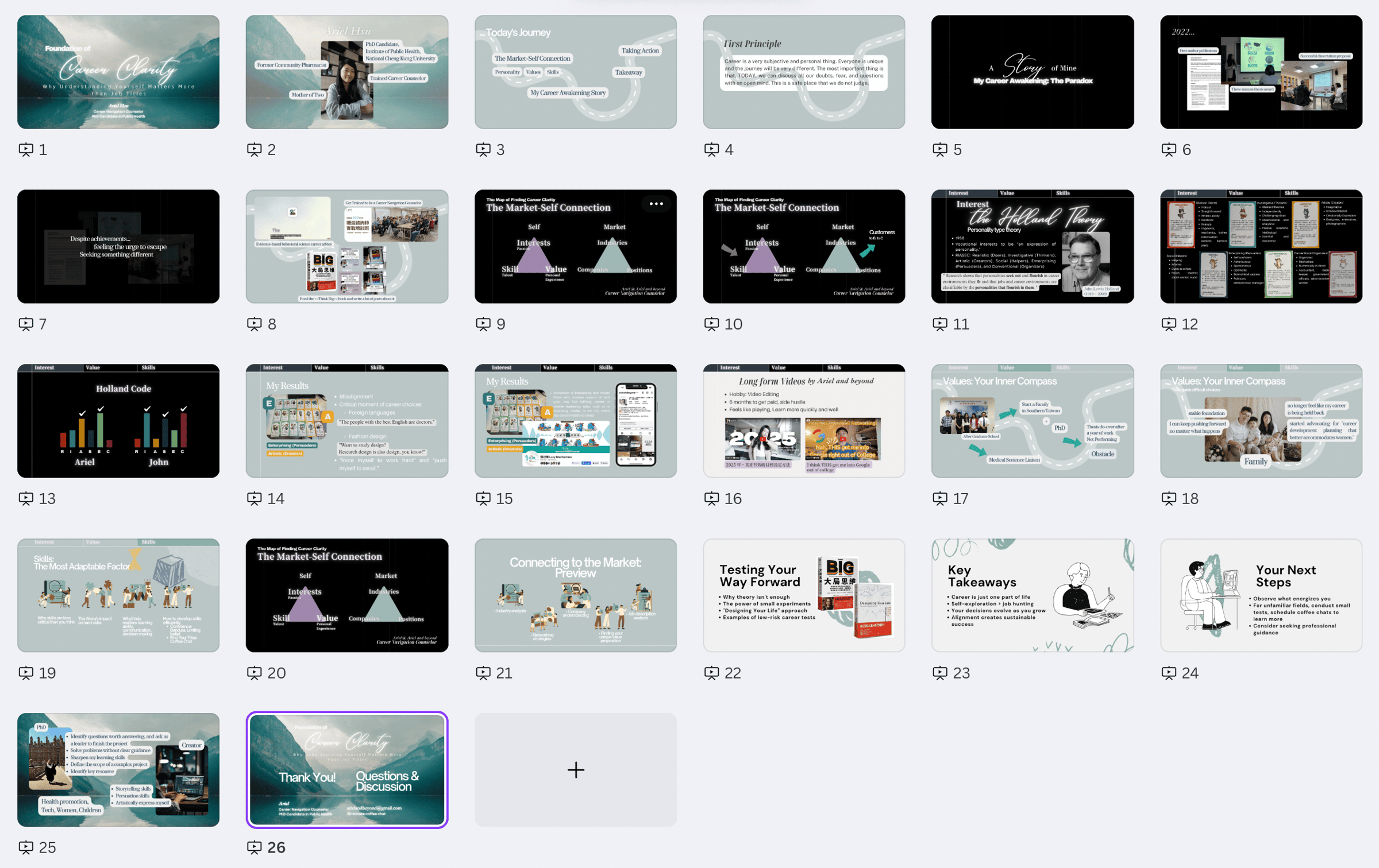 今年一月準備求職面試,在建立自己的「王牌故事」的時候,在 Dr. Harvey 的求職課程 學習到,「王牌故事」最好符合以下幾個條件:具挑戰性、對他人有影響、自己主動推進、沒做到會有負面影響。我透過「職涯理論」解決了自己的職涯迷惘問題,對我來說是超級珍貴的王牌故事,但這個故事有一個最大的問題,就是:跟他人沒有關係。其實就是因為當初在準備面試王牌故事的時候,理解到「對他人有影響」在職場上是重要的事,也是我會期許自己持續突破的事,於是,我終於逼著自己 開始接職涯諮詢的陪跑個案,專注在幫助大家釐清內在、了解自己,及告訴自己要開始演講推廣這些自己覺得很有用的方法!